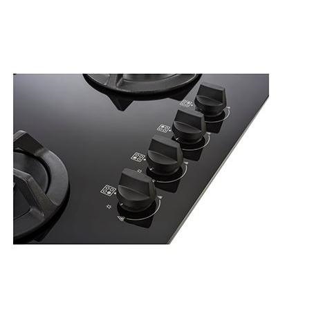 60cm built-in gas through glass hob offers 4 gas burners. Additional features include cast iron pan supports, automatic ignition, front rotary controls, flame safety device and easy clean surface.
