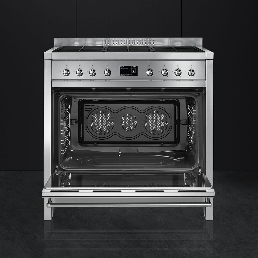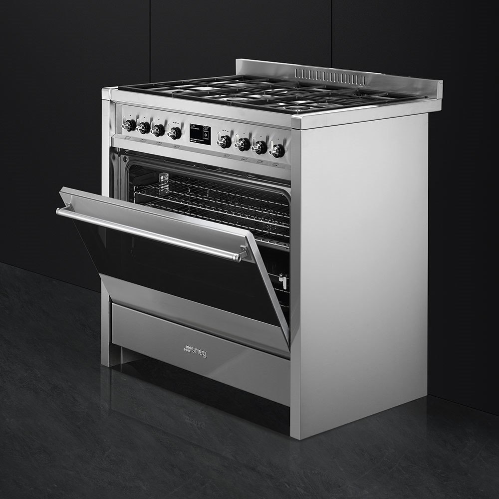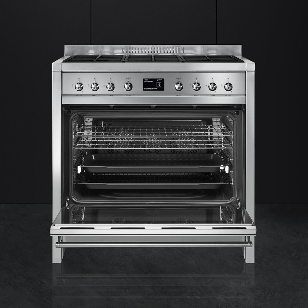 Stainless steel A1-9 Smeg 90cm Opera Stainless Steel Single Cavity Dual Fuel Range Cooker, this A+ energy rated model comes equipped with 129 litres capacity, 10 number of cooking programmes, 6 number of burners and 1 number of cavities. This Smeg range cooker has install dimensions of 90cm (width) x 90cm (height) x 60cm (depth). The A1-9 model also comes with Digital electronic clock/programmer, electronic timer, Air cooling system and a manufacturer’s warranty of 2 years for peace of mind.