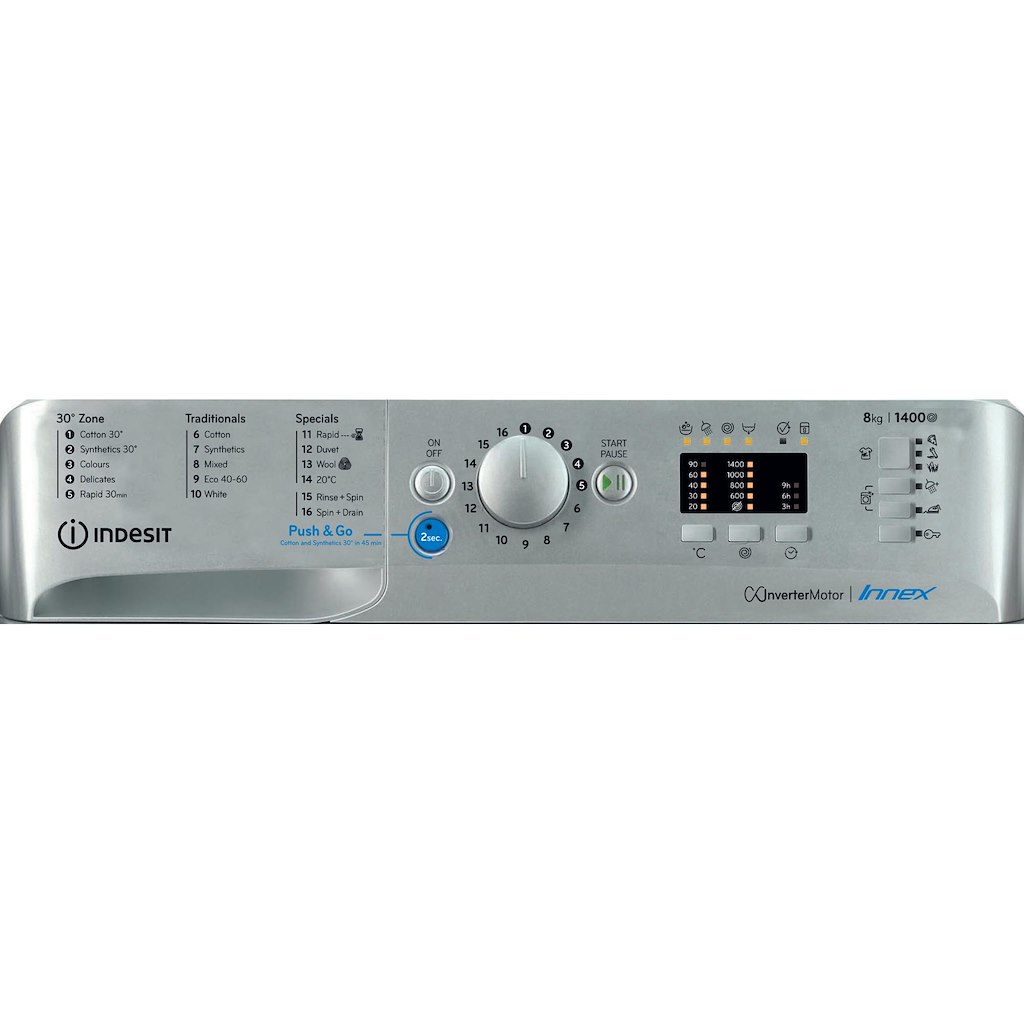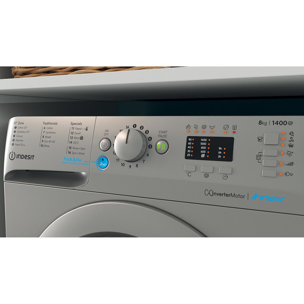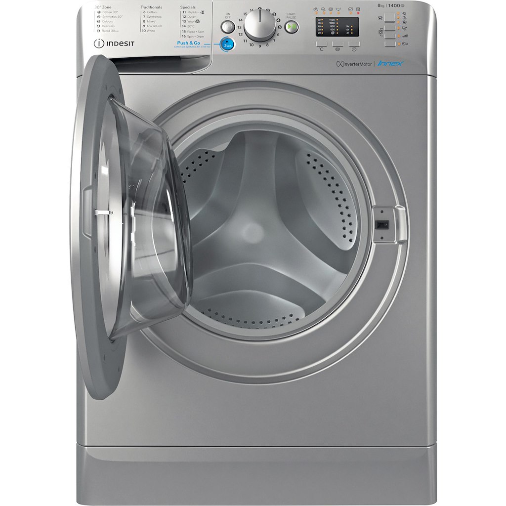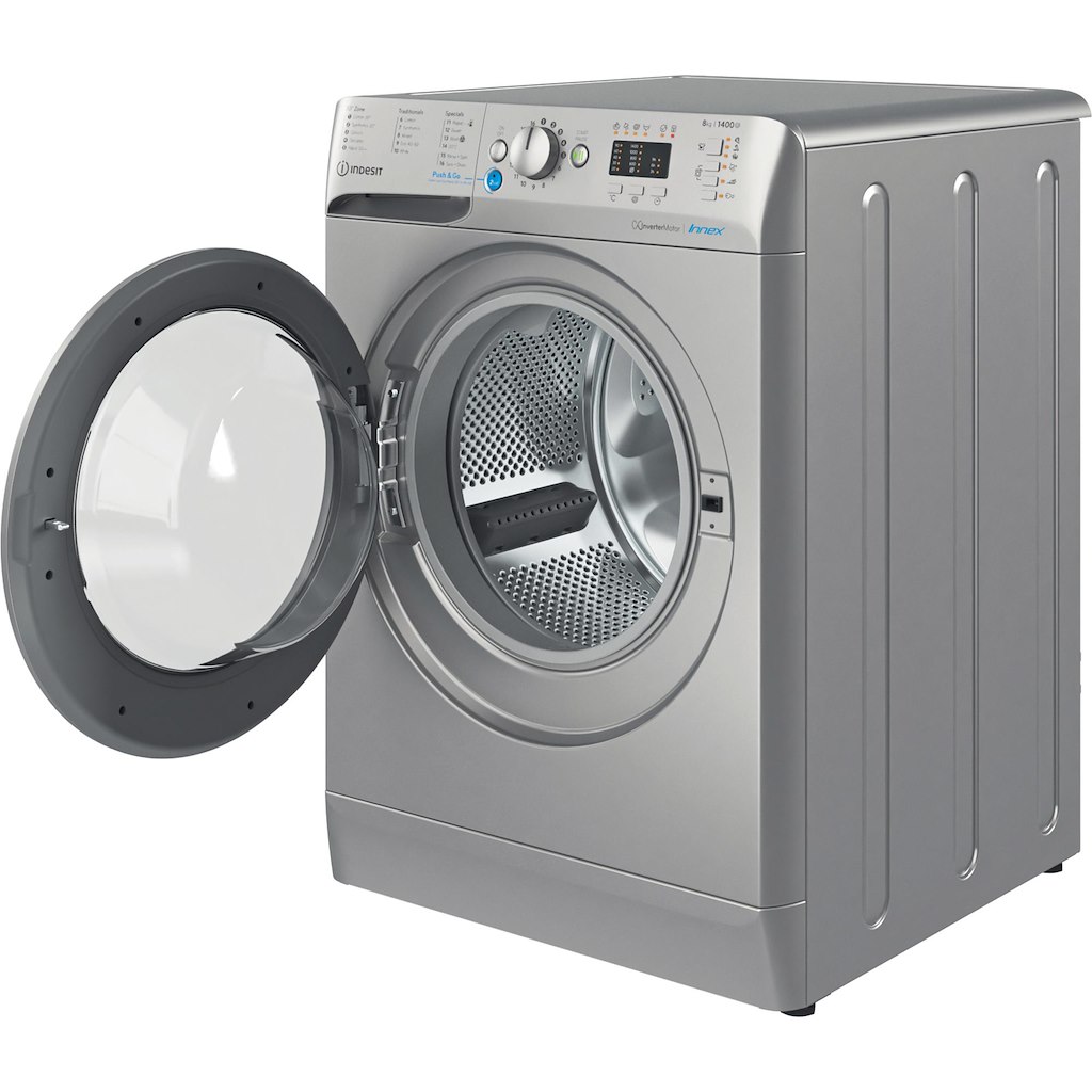 This Indesit freestanding front loading Washing Machine features: a spacious 8,0kg capacity. B energy rating. A fast, resource-efficient 1400 revolutions per minute spin speed. Silver colour.
