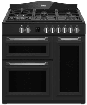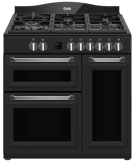 Anthracite Creda 90cm 3 Cavity Traditional Dual Fuel Range Cooker This dual fuel traditional 90cm range cooker comes with a 67 ltr right cavity true fan oven, a 64 ltr bottom left cavity true fan oven, a 30 ltr top left seperate grill, a 5 burner hob with side wok burner, cast iron pan stands and back to black glass which obscures the inside of the cavities until the internal lights are activated, with removeable glass splashback