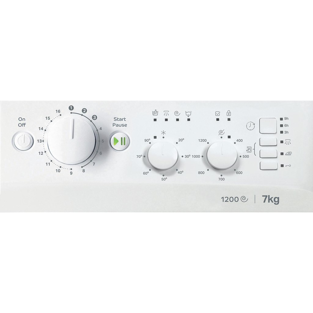 This Indesit freestanding front loading Washing Machine features: a spacious 7,0kg capacity. A fast, resource-efficient 1200 revolutions per minute spin speed. White colour.