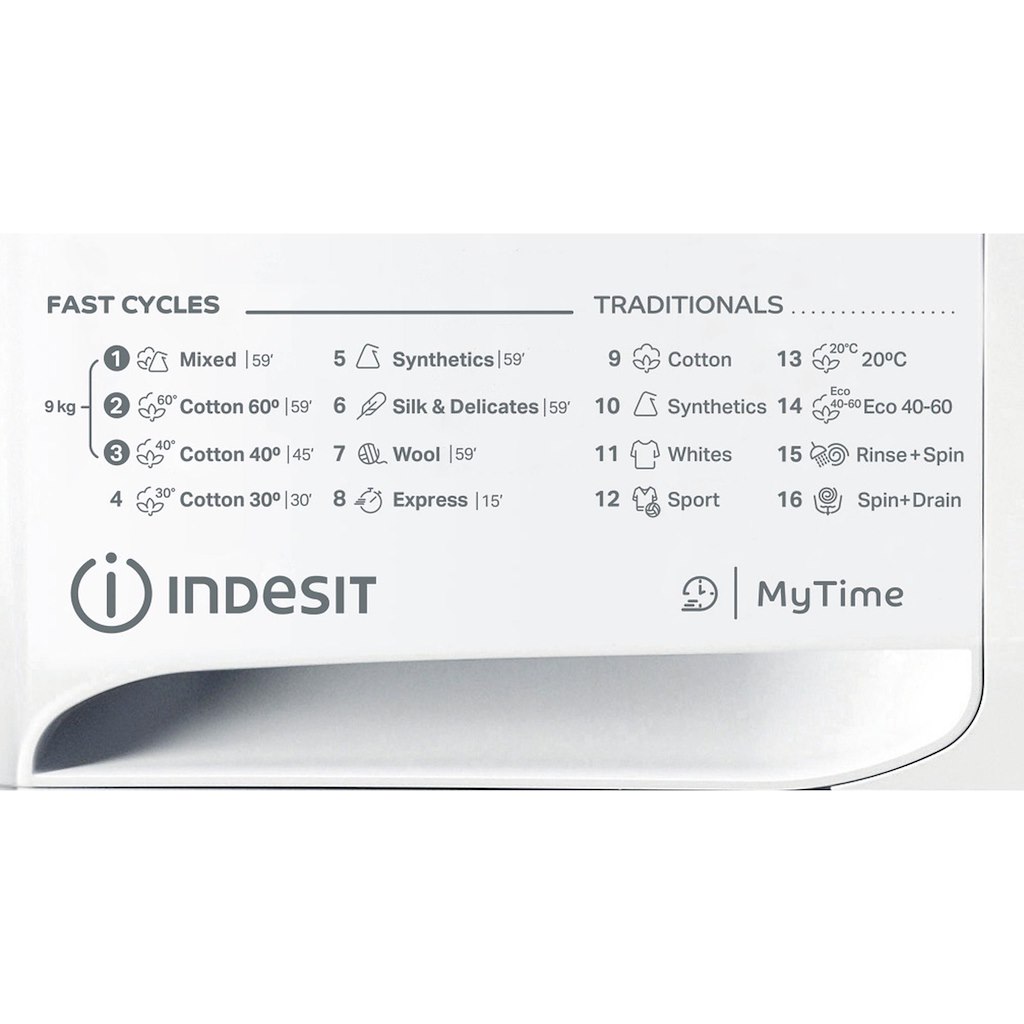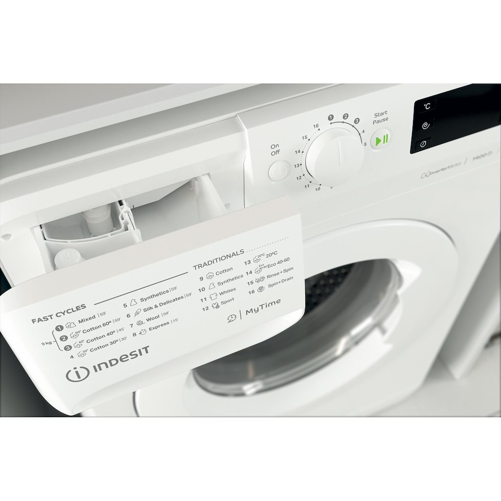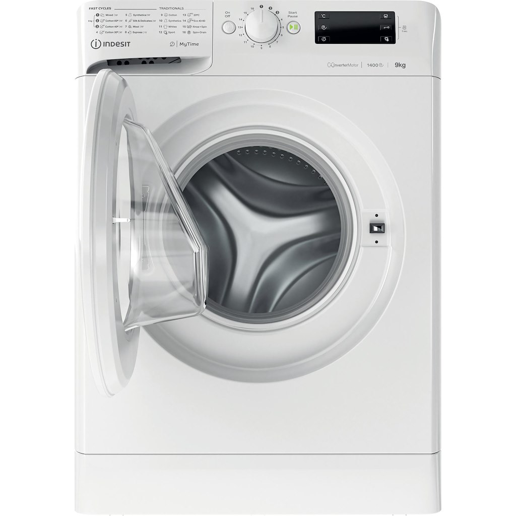 This Indesit freestanding front loading Washing Machine features: a spacious 9,0kg capacity. A fast, resource-efficient 1400 revolutions per minute spin speed. White colour.