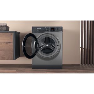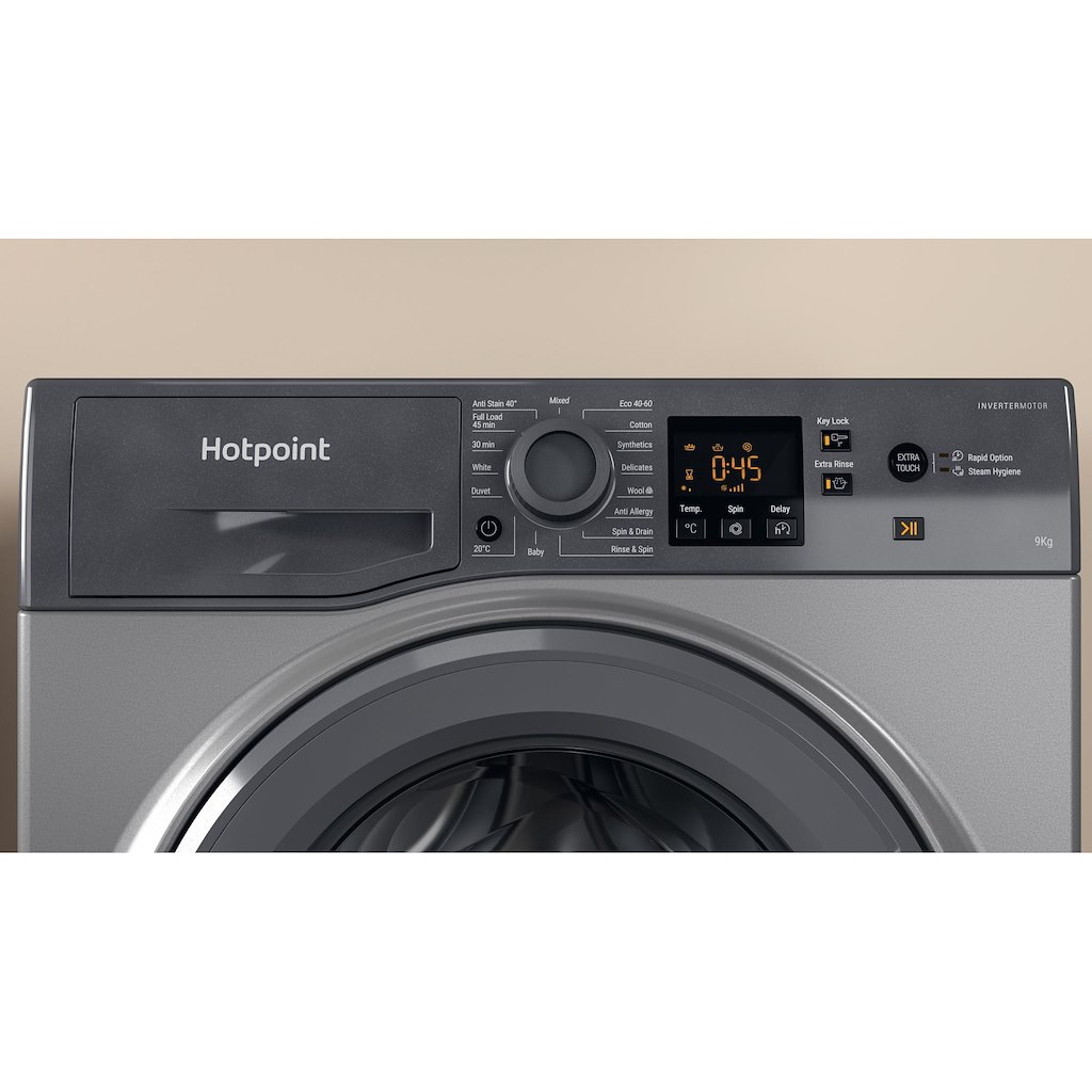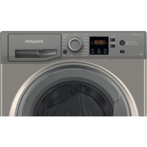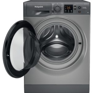 Breeze through your laundry with a washing machine designed to tackle the toughest everyday stains, The Hotpoint NSWM 944C GG UK N Washing Machine with a 9kg capacity and a 1400 spin speed.