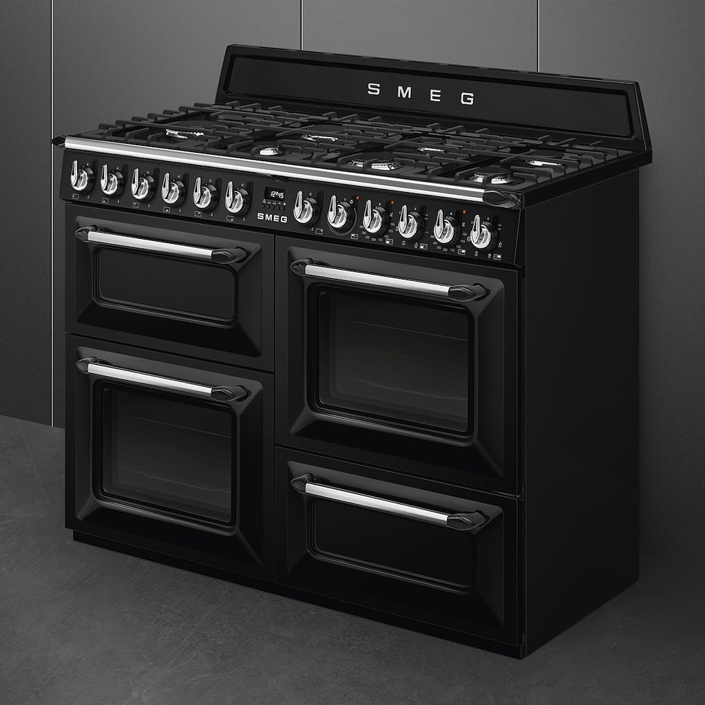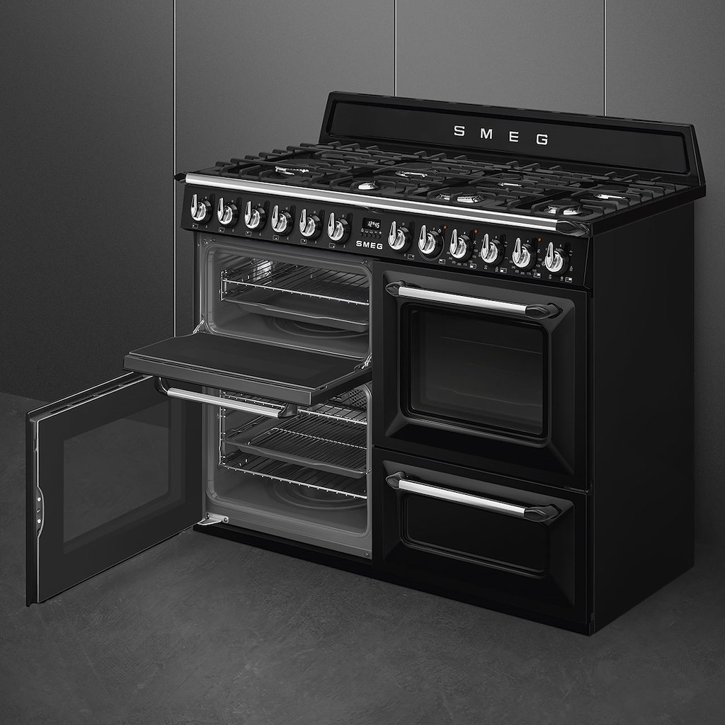 Black Smeg Dual fuel Range Cooker TR4110BL1, this A/A energy rated model comes equipped with 68 litres capacity, 7 number of cooking programmes, 7 number of burners and 4 number of cavities.This Smeg range cooker has install dimensions of 110cm (width) x 90cm (height) x 60cm (depth). Electricgrill fuel, Easy clean enamel interior, Triple glazed oven door, Double glazed door, control panel and a manufacturer’s warranty of 5 years for peace of mind.