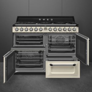 Cream Smeg Dual fuel Range Cooker TR4110P1, this A/A energy rated model comes equipped with 70 litres capacity, 7 number of cooking programmes, 7 number of burners and 3 number of cavities.This Smeg range cooker has install dimensions of 110cm (width) x 90cm (height) x 60cm (depth). The TR4110P1 model also comes with electronic timer, Electricgrill fuel, control panel and a manufacturer’s warranty of 5 years for peace of mind.