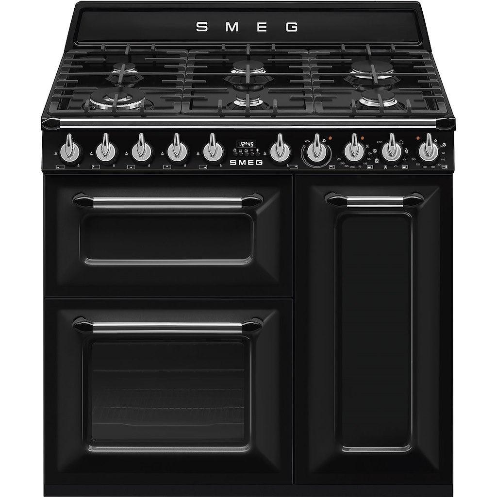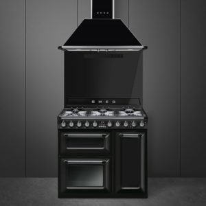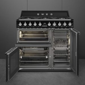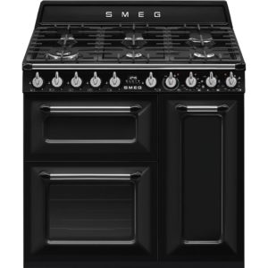 Black Smeg Dual fuel Range Cooker TR93BL, this AB energy rated model comes equipped with 70 litres capacity, 9 number of cooking programmes, 6 number of burners and 3 number of cavities.This Smeg range cooker has install dimensions of 90cm (width) x 90cm (height) x 60cm (depth). The TR93BL model also comes with wok burner, electronic timer, Electricgrill fuel, Buttons/dial control panel and a manufacturer’s warranty of 5 years for peace of mind.