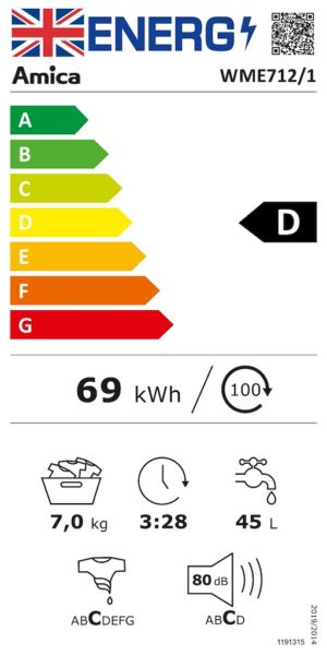 The Amica WME712 1200 washing machine is the ideal Free-standing appliance for your home, with a capacity of 7kg and a spin speed of 1200rpm. With 23 washing programmes, this Amica washing machine comes equipped with a number of features including delay timer, variable temperature settings, multiple spin speed settings, daily wash programmes, economy wash, delicate wash. This washing machine comes with an energy Rating of D+ and an official noise level of 59dB. Amica offers a warranty of 2 years for added peace of mind on your new washing machine. Installation of this Free-standing model is easy, with dimensions for fitting of 59.5cm (width) x 85cm (height) x 49.5cm (depth).